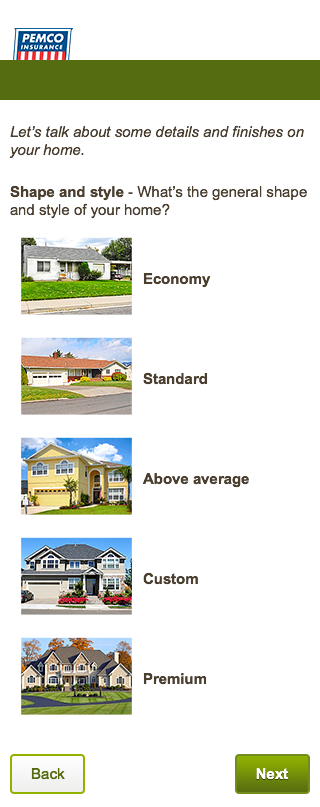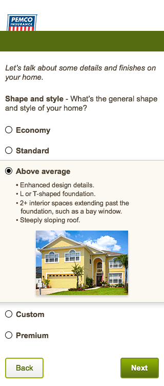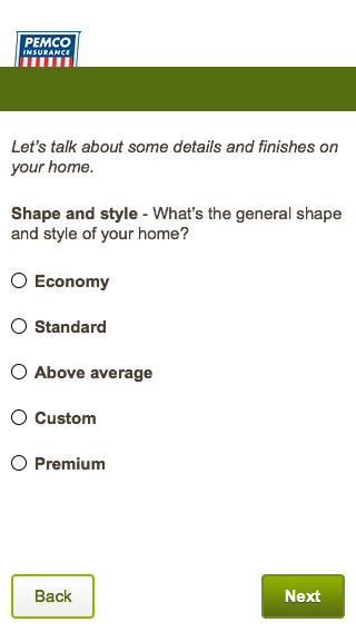 I was tasked with making this better and available to our users on pemco.com. Using a mobile-first approach, sliders actually can be really useful (I just had a flashback to reading Thomas the Tank Engine to my son …) on phones and tablets, however, they are most useful when letting someone define a range (rate this on a scale of one to ten, how much is your package worth, how many in your party). When the options are clearly defined (economy, standard, above avg, etc.) and they have a clear step, the slider starts to lose its purpose. A selector bar would work nicely, but the labels are a little too long. I thought a stepping carousel would work and look well. While clean and elegant, this approach is not accessible to screen readers. A radio button menu will still look good, offer the accompanying help text, and be accessible to all users.